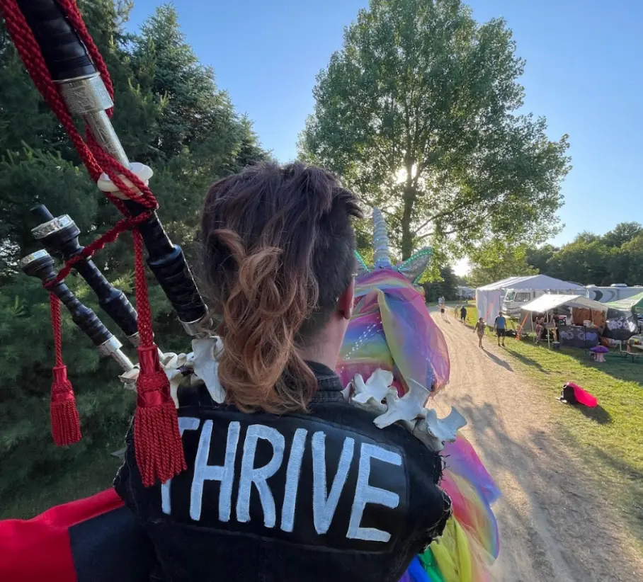 A bagpiper riding a massive unicorn art car, Lakes of Fire 2023